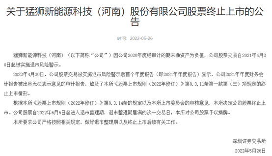 公司于2020年4月7日收到《中国证券监督管理委员会调查通知书》,因公司涉嫌信息披露违法违规,中国证监会决定对公司进行立案调查。 公司于2021年8月13日收到中国证监会下发的《行政处罚及市场禁入事先告知书》,根据《事先告知书》查明涉嫌违法的事实,2019年末虚增净资产18.56亿元,年报显示公司2019年12月31日的净资产为17.21亿元,2020年亏损12.36亿元,2019年12月31日、2020年12月31日追溯调整后的净资产可能为负,可能触及《深圳证券交易所上市公司重大违法强制退市实施办法》第四条第(三)项规定的重大违法强制退市情形,公司股票可能被实施重大违法强制退市。 截至目前,公司还未收到证监会的正式处罚决定。 *ST猛狮债务拍卖与豁免引质疑 5月26日晚被强制退市的还有*ST猛狮。 因公司2020年度经审计的期末净资产为负值,公司股票交易自2021年4月30日起被实施退市风险警示。 2022年4月30日,公司股票交易被实施退市风险警示后首个年度报告(即2021年年度报告)显示,公司2021年年度财务会计报告被出具无法表示意见的审计报告,触及了深交所《股票上市规则(2022年修订)》相关规定的终止上市情形。