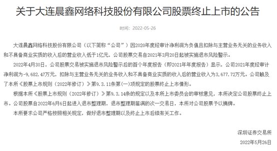 资料显示,绿景控股成立于1988年,前身是海口新能源有限公司,1992年在深交所上市,是国内最早的一批房地产上市公司之一。 年报显示,2017年-2021年间,绿景控股营业收入分别为0.22亿元、0.17亿元、0.16亿元、0.15亿元、1.73亿元,实现的归属母公司股东的净利润分别为-0.83亿元、0.77亿元、-0.09亿元、-0.18亿元、-0.2亿元。其中,2018年,绿景控股通过处置多家子公司股权,获得投资收益使其当年得以扭亏。 值得一提的是,2017年至2020年公司的营业收入都在1亿元以下,但2021年突然增加至1.73亿元。*ST绿景往年主要以房地产业务为主,2021年3月公司以38万元现金方式收购深圳弘益100%股权后新增机电安装工程业务。蹊跷的是,2020年9月才成立的深圳弘益自2021年下半年已与多个客户签订总额约1.8亿元的机电安装合同。 公司年报发布后不久,深交所曾下发对*ST绿景的关注函,问题直指向子公司的机电工程相关业务是否具备商业实质。 2021年公司营业收入1.73亿元,其中机电安装工程业务收入1.22亿元,均来自于2021年3月收购的子公司深圳市弘益建设工程有限公司分包工程收入,对应机电安装工程成本1.17亿元,其中材料/设备采购成本8357.55万元,分包建筑工程施工3262.27万元,材料/设备及分包建筑工程施工成本占机电安装工程成本99.27%,同时机电安装工程业务平均毛利率为3.85%,不能覆盖期间费用。 深交所表示,年审机构核查了与机电工程相关合同、项目工程管理等资料,实施了函证、监盘、访谈等审计程序,但无法实施与项目相关的穿透核查审计程序,因此无法判断该项业务收入是否具备商业实质。 而对于深交所下发的关注函,公司已两次延期,至今仍未回复。 *ST晨鑫试图卖纸保壳未果 深交所宣判退市的还有*ST晨鑫。 因2020年度经审计净利润为负值且扣除与主营业务无关的业务收入和不具备商业实质的收入后的营业收入低于1亿元,*ST晨鑫股票交易自2021年3月20日起被实施退市风险警示。 2022年4月30日,公司股票交易被实施退市风险警示后的首个年度报告显示,公司2021年度经审计净利润为-9682.47万元,扣除与主营业务无关的业务收入和不具备商业实质的收入后的营业收入为3677.72万元。公司触及了深交所《股票上市规则(2022年修订)》相关规定的股票终止上市情形。