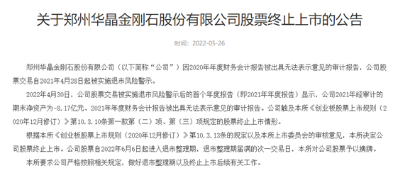 实际上,为了规避退市,*ST晨鑫也曾试图通过新增纸张业务保壳。*ST晨鑫主要通过全资子公司壕鑫互联从事互联网游戏、电子竞技等业务,但电子竞技业务和区块链业务未形成规模,公司连年业绩亏损。2018年,*ST晨鑫归属母公司股东净利润亏损6.14亿元,2019年亏损9.5亿元。 为走出困境,*ST晨鑫跨界并购了主营LCOS芯片的慧新辰,与此同时,公司还成立了全资子公司上海洛秀科技有限公司,主要从事智慧打印综合业务。 但一系列动作后,公司2020年业绩仍亏损0.71亿元,芯片相关业务、纸张业务等贡献营收分别为1767万元、5153万元,占比分别为16.79%、48.96%。 面对与日俱增的退市压力,公司于2020年5月组建全资子公司洛秀科技,注册资金1000万元。 根据公司战略规划,成熟后的智慧打印业务将会包括以搭建智慧图文打印电子商务平台为主体的“e商城”,兼有工程图文专用特种纸系列产品、多种图文制作软件产品、打印设备及印前印后配套设备等硬件产品、图文服务综合解决方案等多维度的产品。 这也就意味着,*ST晨鑫实际上已经成为一家纸业生产公司,与公司给出的经营范围(互联网信息服务、计算机技术领域内的技术开发、图文设计制作等)有所不符。 在2021年年报发布之前,深交所提前发出了对公司的关注函。公司年审会计师致同会计师事务所认为,根据《深圳证券交易所上市公司自律监管指南第1号——业务办理》第4.2条营业收入扣除相关事项的相关规定,公司纸张业务尚未形成稳定的业务模式,2021 年度公司纸张业务收入应作为“与主营业务无关的业务收入”,作为2021年度营业收入的扣除事项。 *ST金刚涉信披违规公司被立案调查 与*ST绿景、*ST晨鑫一起退市的还有*ST金刚。 *ST金刚曾是中国人造钻石行业的龙头企业,主营人造金刚石等超硬材料及人造钻石饰品等,产销规模位居行业前三,一度被称为“人造钻石大王”。公司成立于2004年12月,2010年3月在创业板上市。 因2020年年度财务会计报告被出具无法表示意见的审计报告,*ST金刚股票交易自2021年4月28日起被实施退市风险警示。 2022年4月30日,公司股票交易被实施退市风险警示后的首个年度报告(即2021年年度报告)显示,公司2021年经审计的期末净资产为-8.17亿元、2021年年度财务会计报告被出具无法表示意见的审计报告,触及股票终止上市情形。