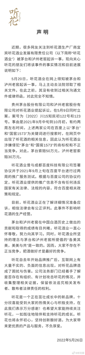 据了解,贵州茅台和泸州老窖对听花酒业提起诉讼,事由是2021年9月中旬到10月初,有约两周左右时间,两家公司在百度上以“茅台”和“国窖1573"为关键词进行搜索时,在网页中出现了听花酒的相关信息,因此认为听花酒业涉嫌侵犯“茅台”和“国窖1573”的商标权和不正当竞争。对此,茅台索赔50万元,泸州老窖索赔30万元。 听花酒业回应:与百度公司的协议符合规定 5月26日,听花酒业对此事进行了回应,表示公司5月20日在网上得知被茅台和泸州老窖起诉一事,马上主动去法院领取了相关文件。在此之前,其没有收到过相关沟通文件或律师函,对此完全不知情。