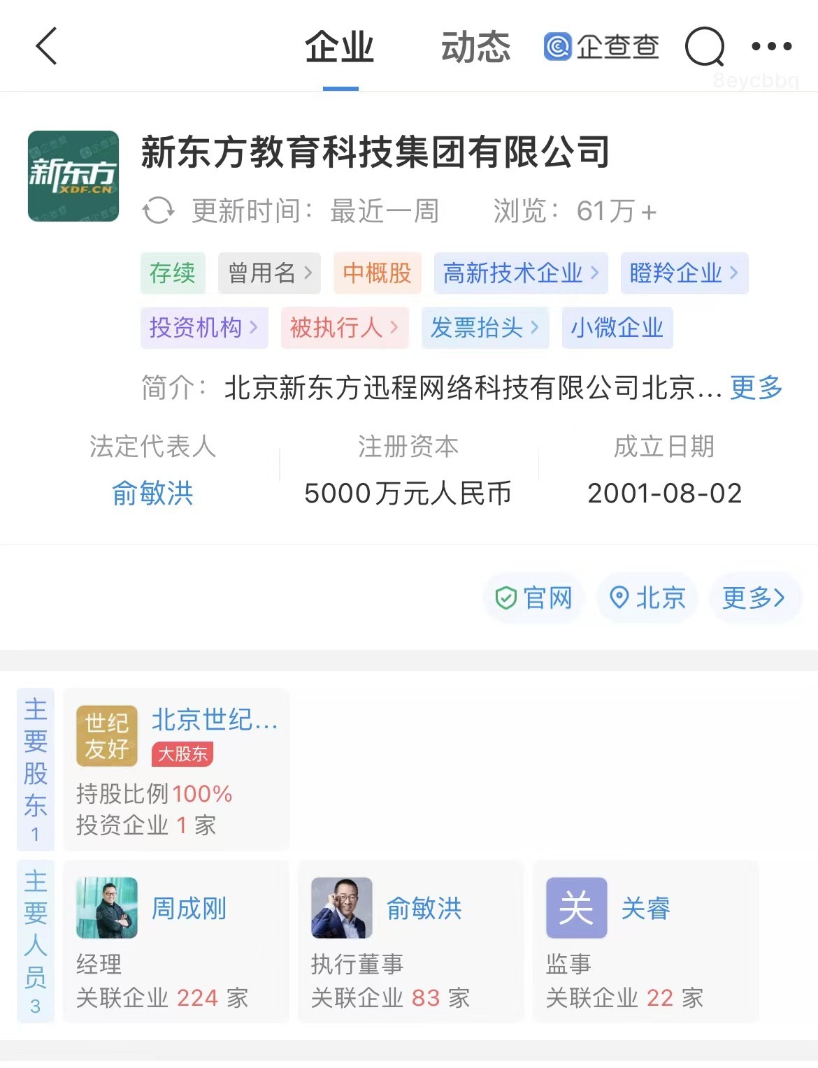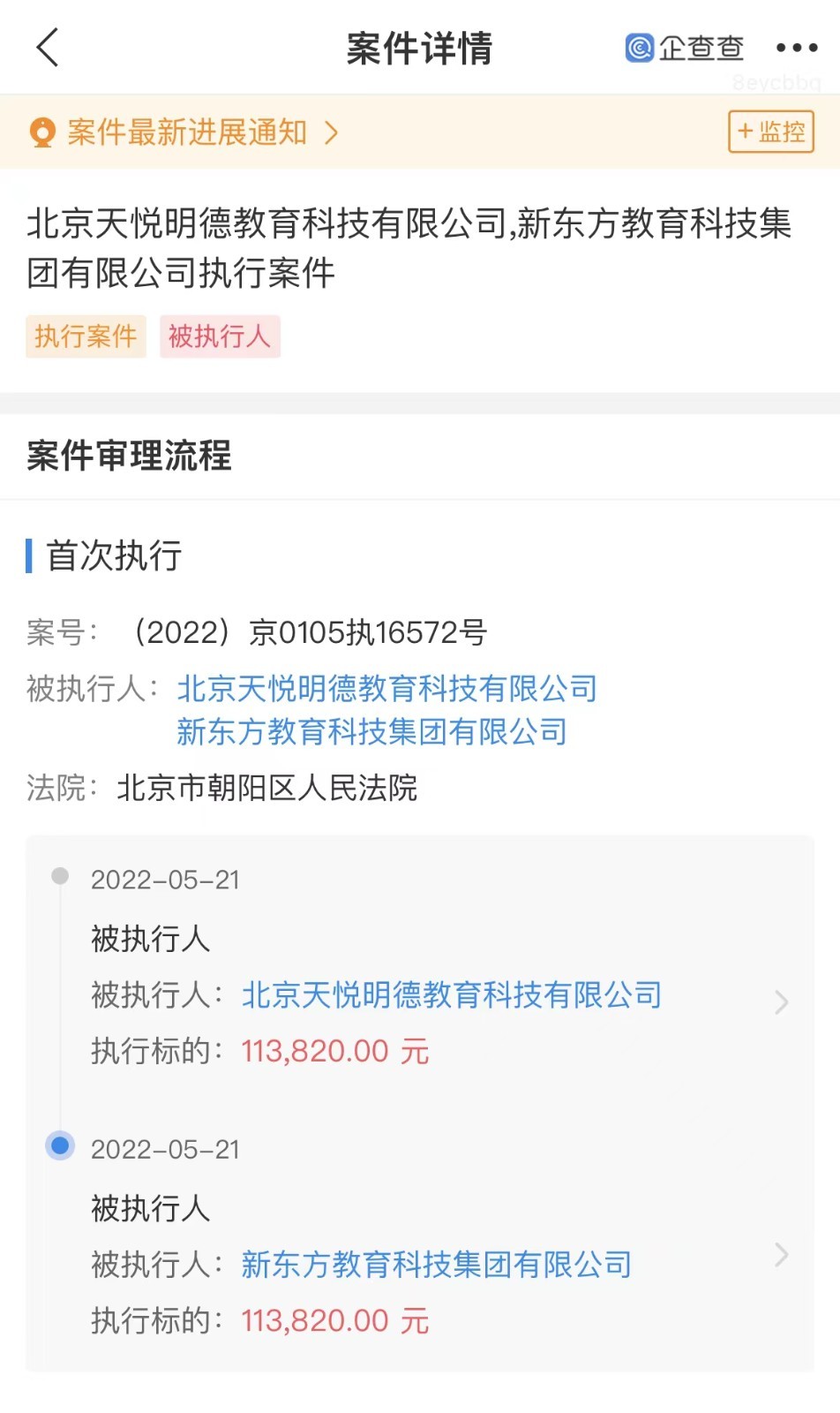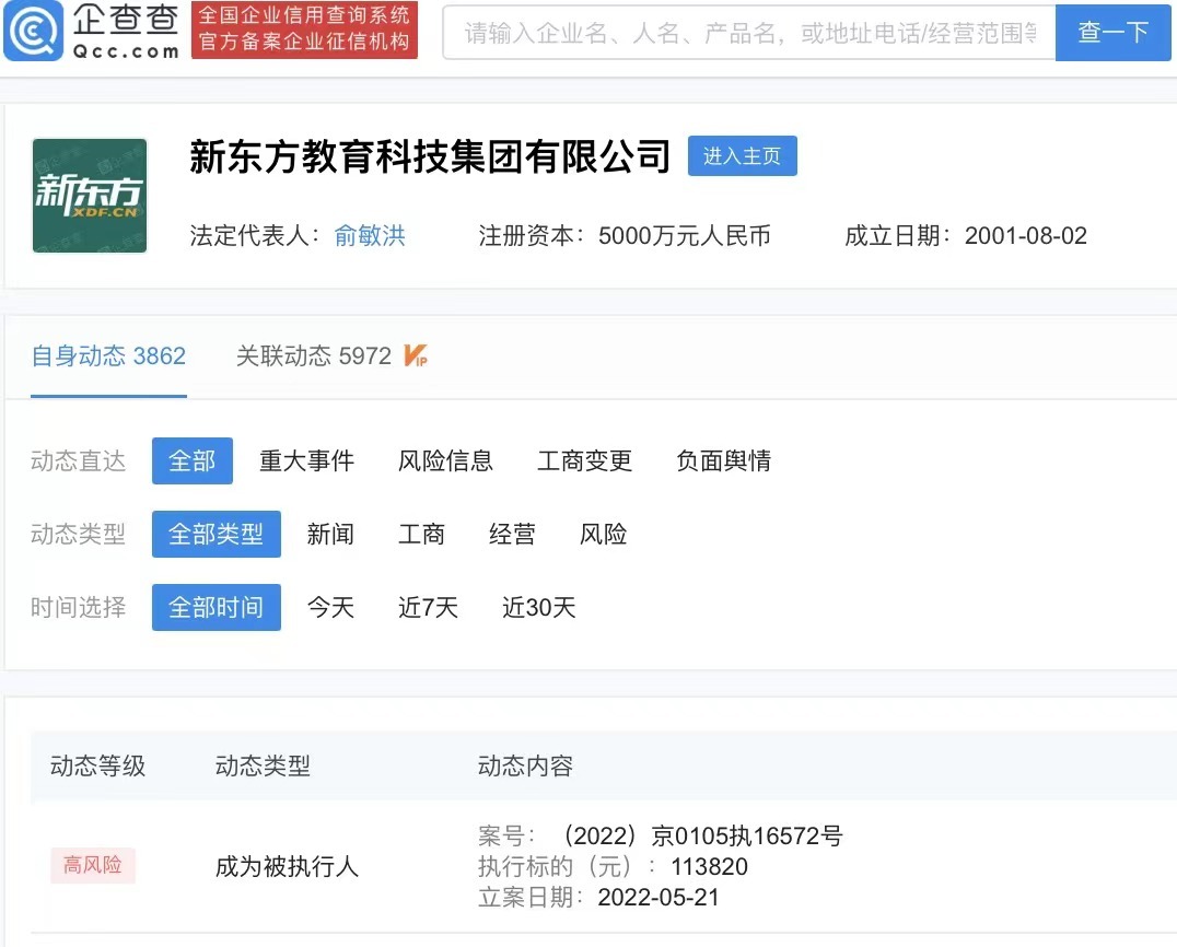 鞭牛士 5月23日消息,企查查APP显示,近日,新东方教育科技集团有限公司新增被执行人信息,执行标的113820元,关联案件涉及教育培训合同纠纷,执行法院为北京市朝阳区人民法院。企查查信息显示,该公司实控人、最终受益人为俞敏洪。